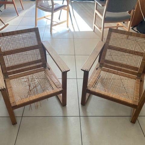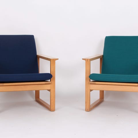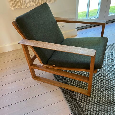 Børge Mogensen, Slædestole, lænestole, 2 velholdte Børge Mogensen slædestole samt en fodskammel, alle 3 dele fra omkring 1960, alle med nyt Cotil betræk og nye hynder. Flet helt intakt. Gjorde på den høje stol kan skiftes med fordel, men er ikke i stykker. Har været i familiens eje i over 60 år. Sælges samlet.