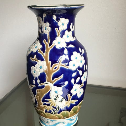 Kinesisk vase med krakelering effekt i glasuren og blå motiver. 1700'tallet (fra Lauritzs vurdering for nogle år siden).