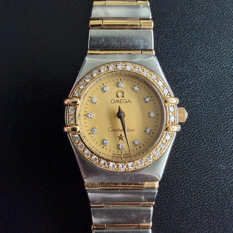 Omega Constellation dameur i kombination af stål og guld. Urkasse og lænke er udført i tofarvet metal med guldtonede detaljer. Skiven er gylden med diamantindeks og romertal på bezelen. Analog visning med time-, minut- og sekundviser. Uret leveres med original æske, yderboks, ekstra lænkeled samt tilhørende garantikort og certifikater. Velegnet som armbåndsur til kvinder.