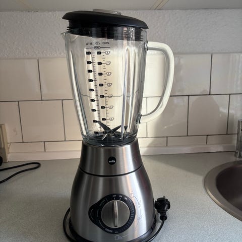 Wilfa blender med glasbeholder og sort base. Blenderen har drejeknap på fronten med flere hastighedsindstillinger samt funktioner markeret til blandt andet isknusning, smoothies og supper. Kanden er forsynet med håndtag og tydelig måleskala. Velegnet til daglig brug i køkkenet til blendning af drikke, madlavning og knusning af is.