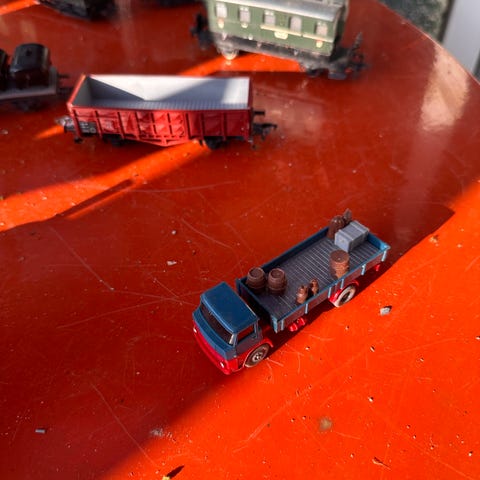 Blandet lot med modeltog og model-lastbiler. Sættet omfatter flere lige skinner, en passagervogn samt forskellige lastbiler med trailere i flere farver og dekorationer. Egnet til modeljernbane eller som samlerobjekter. Målestok og mærker fremgår ikke tydeligt af billederne og bør kontrolleres af køber efter behov.