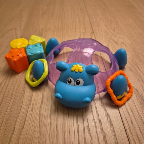 Fisher-Price legetøjsflodhest med bolde i blå plast. Legetøjet forestiller en flodhest med åbning i midten, hvor de medfølgende farvede plastbolde kan lægges i og tages ud igen. Der er gennemsigtig kant rundt om skålen samt en lille grøn figur på kanten. Egnet som aktivitetslegetøj til mindre børn til leg med bolde og øvelse af hånd-øje-koordination.