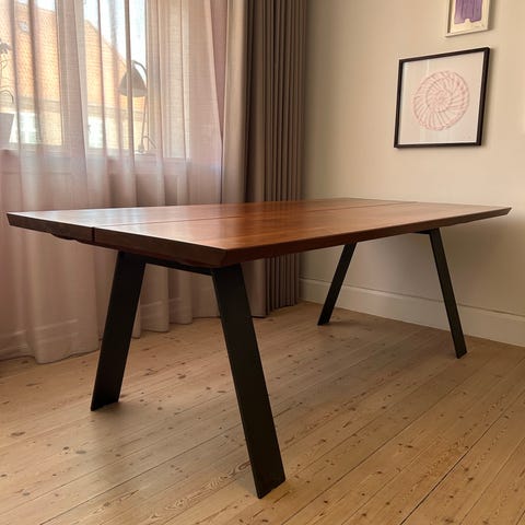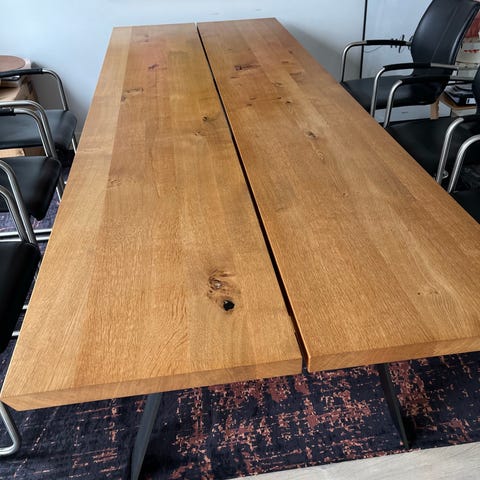 Naver GM 3200 Plank spisebord - træsort ASK hvidolie - ben sorte oliebrændt stål. længde 240x bredde 100 x højde 74. Der medfølger 2 stk tillægsplader extension leaf solid i samme træsort ask hvidolie - størrelse 50x100. Prisen er inkl. plader