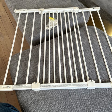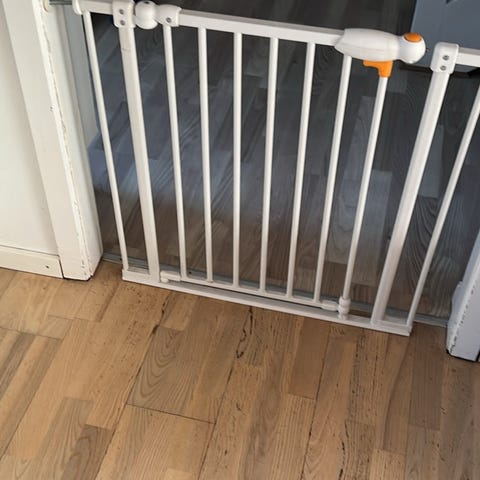 Salene børnegitter købt i JYSK. Bredde 67 cm - 105,5 cm. Højde 70 cm.