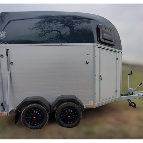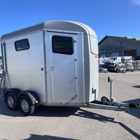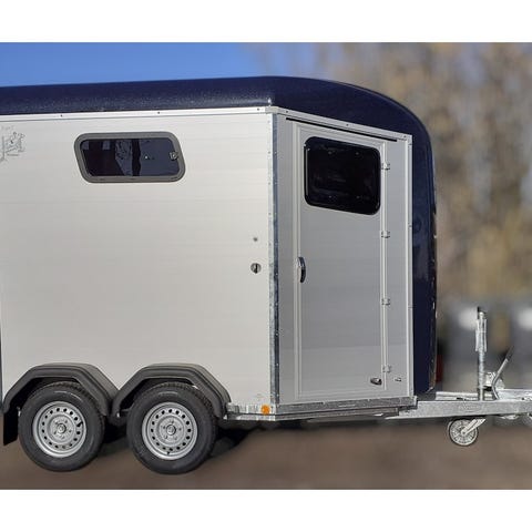 Model: Portax Esprit Antal heste: 2 Highlights: 2-vejs rampe (bagrampe / dør-kombination) MMS system. Justerbar bomsystem låseknop, som skubbes ind i et beslag Justeres i højden forrest og længden bagerst som kan udløses udefra ved nødsituationer. Ekstraudstyr: Bagrampe med skridsikker gummimåtte, riller og side-stop Sadelrum med teleskopisk sadelholder. Opbevaring til kost, skovl, spejl og net Sparkbeskyttelse Støddæmpere Opbygning: Presenning rullegardin Skydevinduer med gitter på begge sider Pop-up vinduer foran Fuldlimet og forseglet gummigulv Stærke sidevanger og V-træk Mekanisk bremse CFF plus almindelige aksler Indvendig indretning: Indvendig belysning Transparent PVC-skillevæg med overdel