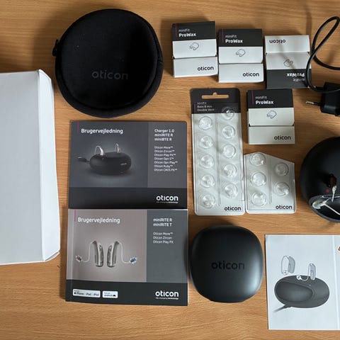 Det er modellen med batteri og der medfølger en hel kasse med batterier, samt 8mm hætter til selve øret, samt manual