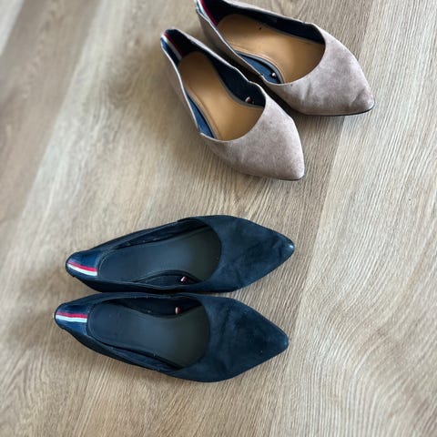 Vagabond ballerina sko i str. 40. Skoene har beige overdel med sort snude og flad sål. Klassisk ballerina-model egnet til hverdagsbrug og kontor. Overdel og hælkappe fremstår i ruskindslignende materiale med gummisål under bunden. Velegnet som damesko til både bukser og kjoler.