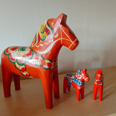 &Tradition dekorationsfigur formet som en hest i malet træ. Figuren er blå med håndmalede mønstre i flere farver. Velegnet som pyntegenstand på hylde, reol eller bord i stue, entré eller andre rum i hjemmet.