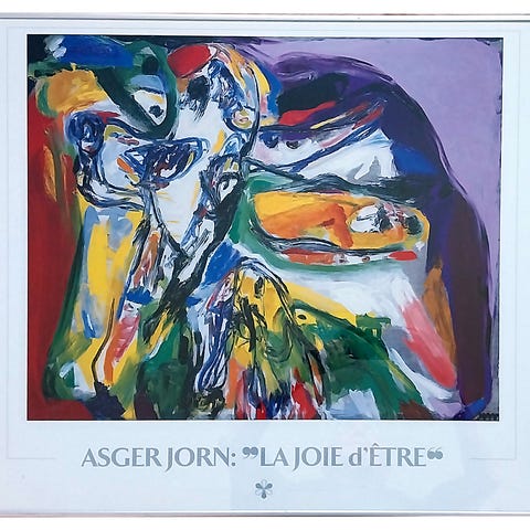 Plakat af Asger Jorn i glas og ramme . "La Joie d'etre" B:81 cm H: 61 cm. Pris 1700 kr.
