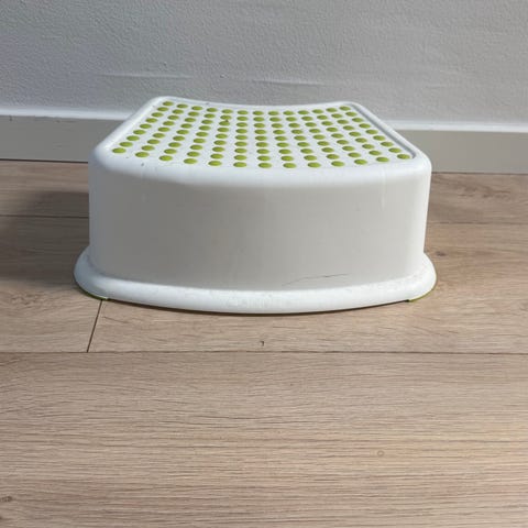 Fin plastik skammel til badeværelse. Målene på plastikskamlen er ca. højde 14, længde max. 40 og dybde max. 27 cm.