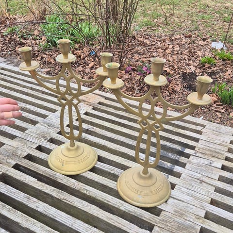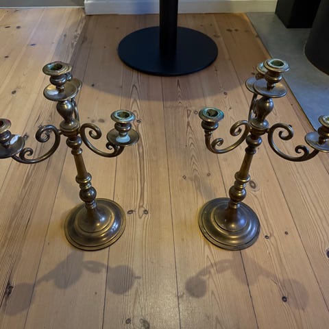 Sæt af to 3-armede lysestager i messing. Klassisk design med rund fod og fem lyseholdere på hver stage. Velegnet til almindelige stagelys og kan bruges som borddekoration eller på en skænk. sælges for Lions Club Hellerup