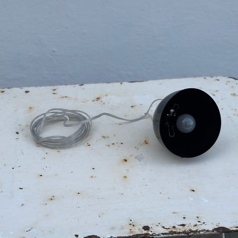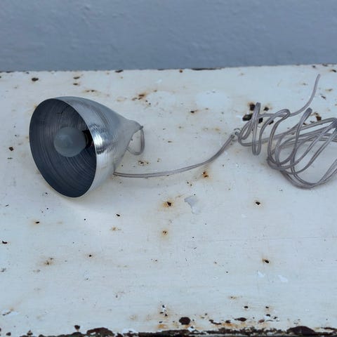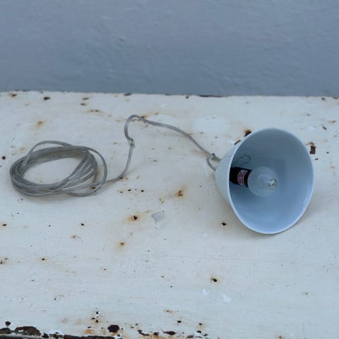 Fatning med tænd/sluk i hvidmalet metal med en hvid ledning af nyere dato.