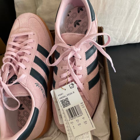 Adidas Handball Spezial sneakers i størrelse 40. Modellen er i sort med hvide striber og hvid hælkappe samt brun gummisål. Overdelen er i ruskind med snørelukning. Velegnet som hverdagssko eller fritidssko.