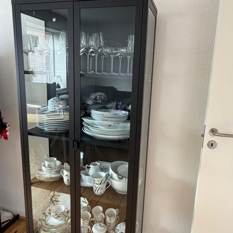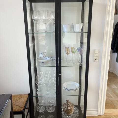 Vetrineskab i sort metal med glas. Har aldrig været i stykker og nærmest ingen brugsspor.
