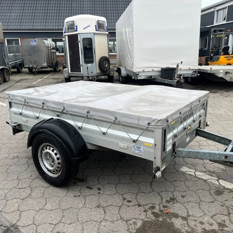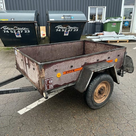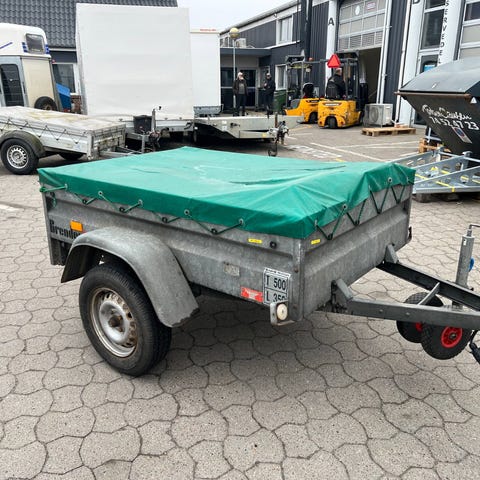Brugt hobbytrailer fra Brenderup med stålsider, presenning og næsehjul.