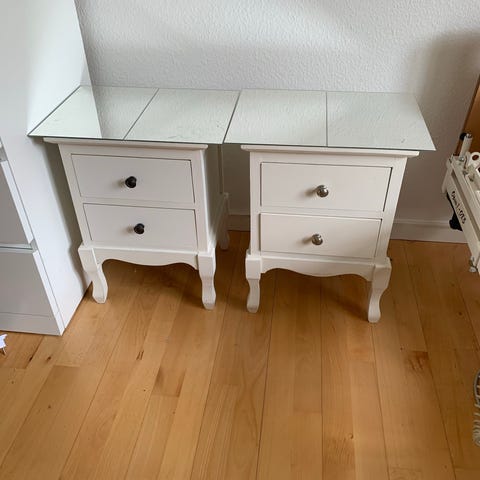 2 velholdte, runde og hvidlakerede sengeborde med GLAS bordplader sælges. Samlet pris 300 kr.