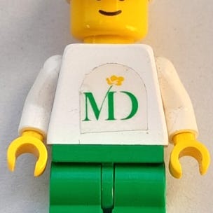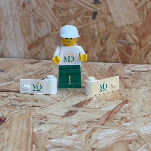 LEGO System minifigur med tryk af MD Foods på torso for- og bagside. Figuren har hvid kasket, hvid overdel med grønt MD Foods-logo og grønne ben. Egnet som samlerfigur eller til brug i LEGO-byggerier med tema relateret til mad eller industri.