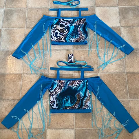 Til hver top følger: hårtårn, 2 hårbånd og halsbånd. OBS: Pris er for begge, dvs 645 kr pr stk. De sælges kun samlet.