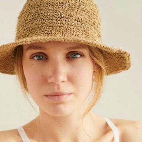 Hatten er lavet af 100 % papir med et sort bånd af grosgrain.
