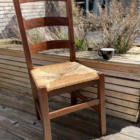 10 Stole i massivt bøgetræ, fra 1950erne. Polstringen er i stribet beige velour.
