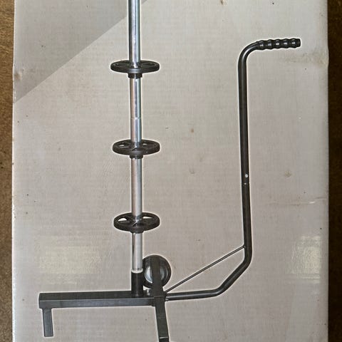 Dækvogn med stativ til opbevaring og transport af hjul og dæk. Vognen har lodret stativ med flere ringe til placering af hjul oven på hinanden. Nederst er der hjul, så vognen kan køres rundt, samt et håndtag til at styre og trække vognen. Egnet til opbevaring af bilhjul eller andre hjul i garage, værksted eller lignende.