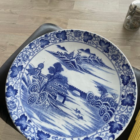 Blå-hvid tallerken engelsk keramik med landskabsmotiv i porcelæn