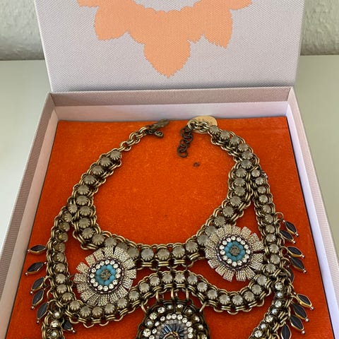 På smykkets ene side er der indsat cognacfarvet læder og en pink nylonsnor. På den anden side er smykket udstyret med en flettet detalje. Smykket kan bæres begge veje og kan indstilles i længden.