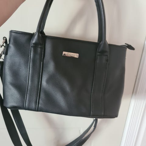 Calvin Klein håndtaske til kvinde i sort materiale. Tasken har to korte hanke samt en aftagelig og justerbar skulderrem, som kan ses på billederne. Den lukkes med lynlås foroven og har flere indvendige rum/inddelinger til organisering af indhold. Metaldetaljer og logo-plade foran er i en lys metalfarve. Velegnet som mindre hverdagstaske eller til brug ved lejligheder, hvor der er behov for en kompakt taske til de vigtigste ejendele.