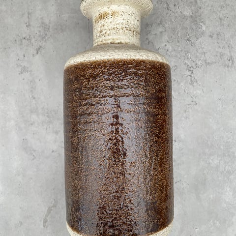 Soholm stentøjsvase model 3322 i blå glasur. Vasen er udført i stentøj med geometrisk reliefmønster på korpus og glat hals. Undersiden er mærket med "Soholm Denmark Stentøj" og modelnummer 3322. Velegnet som dekorativ vase til f.eks. enkeltstående grene eller blomster samt som del af en samling af Soholm stentøj.