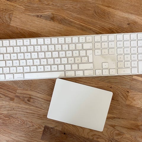 Apple tastatur og pegefelt til computer. Trådløst sæt bestående af et numerisk tastatur i hvidt design samt et separat pegefelt. Egnet til brug med stationær eller bærbar computer, f.eks. til kontorarbejde, studie eller hjemmebrug, hvor der ønskes et eksternt tastatur og pegefelt.