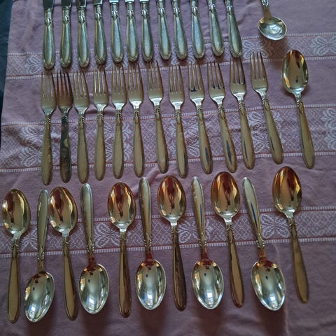 8 gafler, 11 spiseskeer og 12 knive