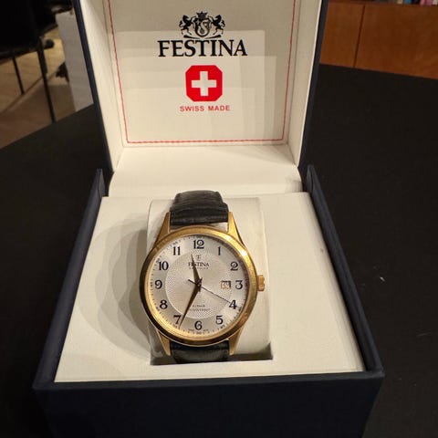 Uret er i perfekt stand - som nyt. Men remmen er en ældre rem som er sat på efterfølgende - fordi jeg skulle bruge den originale rem på andet ur. Festnina herreur med rund urkasse i metal, sort urskive og analog visning. Uret har tre mindre subskiver på urskiven og tydelige timemarkeringer. Remmen er i brun læder med spænde lukning. Velegnet som klassisk armbåndsur til mænd til daglig brug eller mere formelle anledninger.
