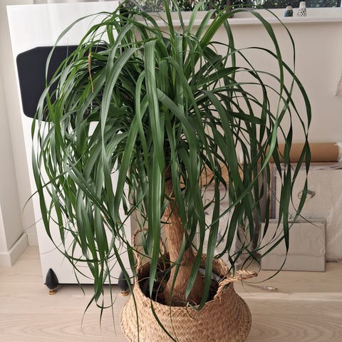 Palme (Beaucarnea recurvata) med savtakkede blade og Stor Klumpagtig stamme, hvorfra sammenligningen med Elefant stammer. Disse palmer kan blive Meget gamle og omfangsrige. Denne her er minimum +30år gammel og nedklippet mange gange med godt resultat. Sidste nedklip for nogle måneder siden, hvorfor de ift stammetykkelse og højde ikke har ret meget bladfylde. Dette kommer og planterne trives.
