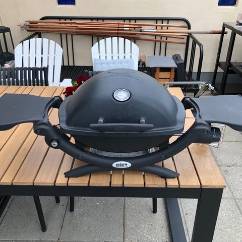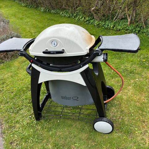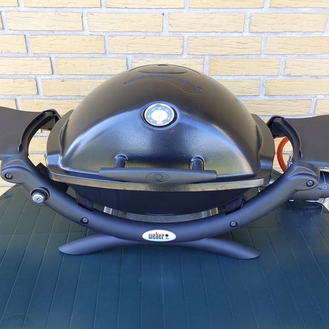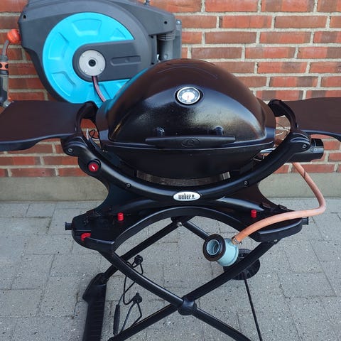 Weber Q 1200 gasgrill med låg og grillrist, monteret på sammenklappeligt stativ med hjul. Grillen har to faste sideborde til afsætning af tilbehør. Masser af helt nyt og næsten nyt udstyr som eksempelvis flot originalt Weberværktøj med olierede skafter, grillrist, 16 spyd, ubrugte foliebakker, grillhandsker og rengøringsmidler medfølger. Til opbevaring medfølger heldækkende overtræk. Nypris for det hele omkring 4.000 kr.