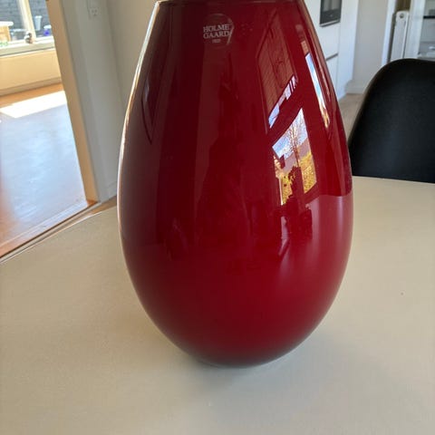 Holmegaard vase i rødt glas. Oval, glat form med blank overflade, egnet til dekoration og blomsterarrangementer i hjemmet.