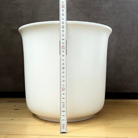 Urtepotteskjuler/urtepotte, stor, hvid. Højde 22 cm., udvendig diameter for oven 28 cm. Der er en smule kalk i bunden af potten. Ingen skår. Ingen revner,.