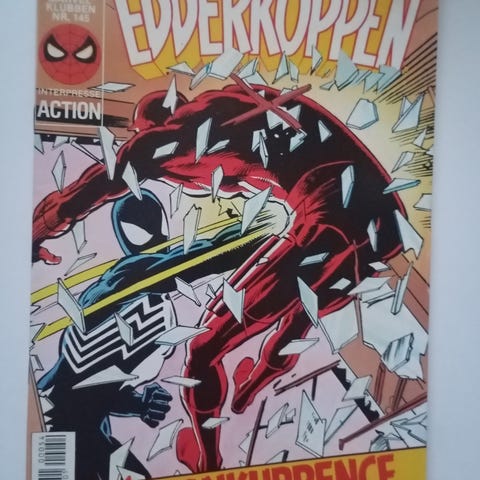 Edderkoppen tegneseriehæfte på dansk. Forsiden viser Edderkoppen i kamp mod en modstander foran en baggrund med høje bygninger. Bagsiden har reklame for andre tegneserier fra abonnementsklubben Comics. Trykt i farver og egnet til samlere af superhelte- og Marvel-relaterede tegneserier på dansk.
