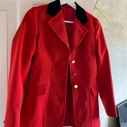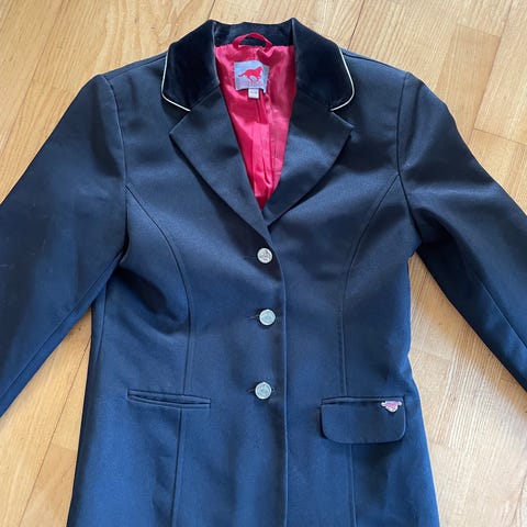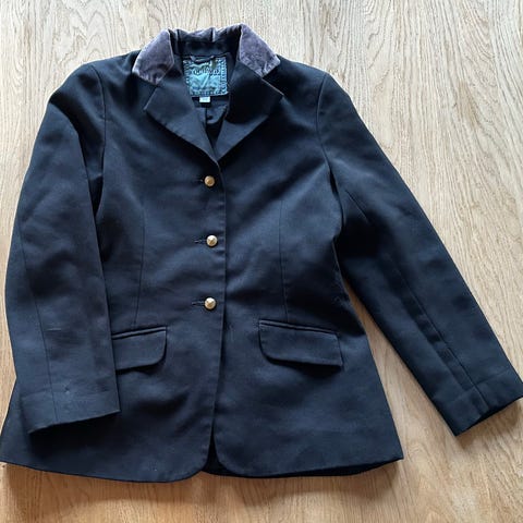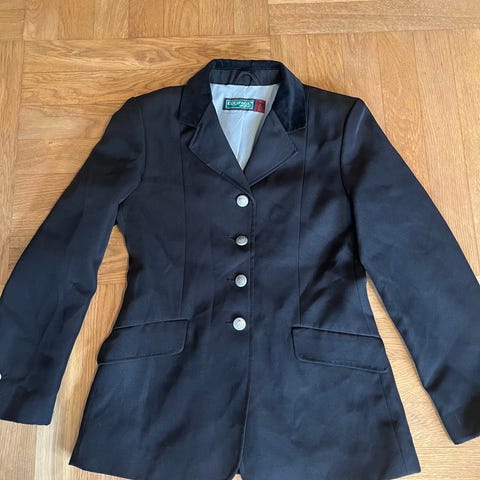 Stævne jakke til pige i sort farve. Jakken har klassisk reverskrave og lukkes med tre guldknapper foran. Der er to forlommer med klap. Str. 10-12 år.