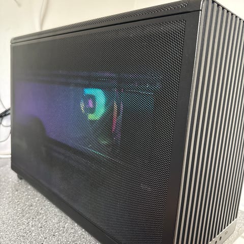 Asus stationær computer i kabinet med glas-sidepanel. Kabinettet har frontgitter for luftindtag samt bagmonteret blæser. Der er flere udvidelsespladser på bagsiden til ekstra kort og tilslutninger. Velegnet som almindelig stationær pc, afhængigt af den installerede hardwarekonfiguration, som ikke fremgår af oplysningerne her.