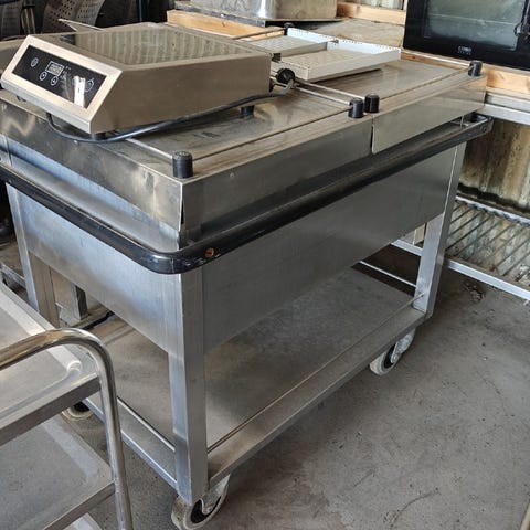 Rustfri stålvogn med varmebænk og opbevaringsskabe på hjul