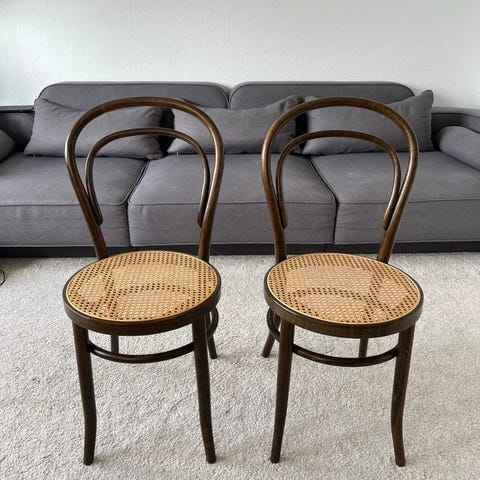 Hej. Vi sælger 2 af disse fine lounge stole i træ og fransk flet. Stolene er i pæn stand. Der er almindelige brugsspor i form af ridser eller lignende hist og her, men ikke noget, der springer i øjnene. De er solide og gode at sidde i. Der medfølger læderhynder. Det franske flet er intakt og stramt.