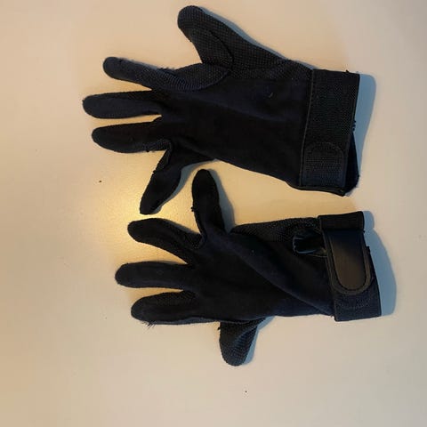Sorte ridehandsker til børn, str. S. Handskerne har lukning ved håndleddet og elastik for bedre pasform. Velegnet til ridning og anden udendørs brug, hvor der er behov for et godt greb og beskyttelse af hænderne.