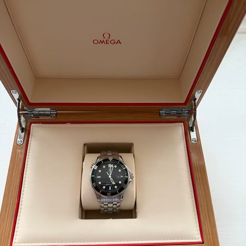 Omega Seamaster 300M Titanium / Guld 18 karat ref 2296.80.00 fra ca 2000 med box og diverse manualer , uret er i fantastisk stand og var sendt til omega for stort rep og der er udskiftet alt fra krone viser og rigtig meget andet , alle udskiftede dele kom med retur og uret må betegnes med et nærmest nyt værk da det ikke har været brugt siden , tænker ikke denne model findes i bedre stand , den røde original box er desværre ikke så køn