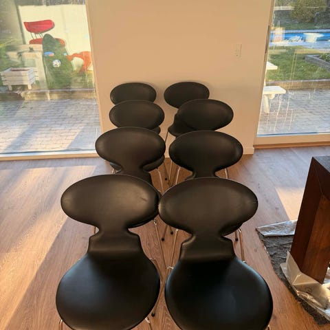 4 flotte sorte læder hynder til Arne Jacobsen 7'er eller myrestole. Pr. stk. 100 kr. og samlet 300 kr.