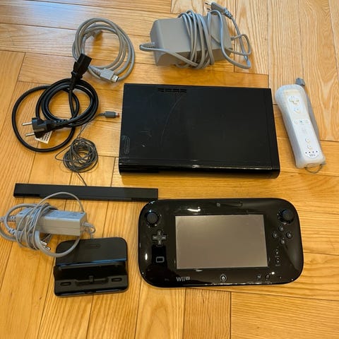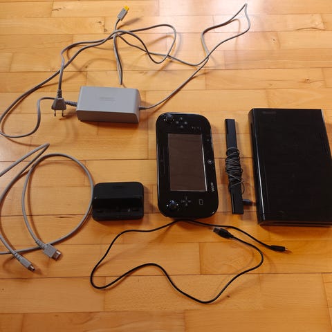 Nintendo Wii U konsol 32GB sort med matchende Wii U GamePad. Konsollen har indbygget 32 GB lagerplads til spil og data. Sættet omfatter strømforsyning til konsol, oplader til GamePad, sensorbar, ladestand til GamePad samt kabler som vist på billederne. Velegnet til brug med Wii U spil og kompatibelt Wii-tilbehør efter behov.