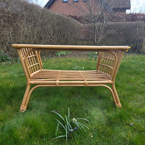Lækkert sofabord i lakeret bambus og flet med bladhylde og glasplade. Længde 110 cm. Bredde 60 cm. Højde 51,5 cm. Lidt ridser i glasplade og lidt nus i flettet. Ellers pænt.