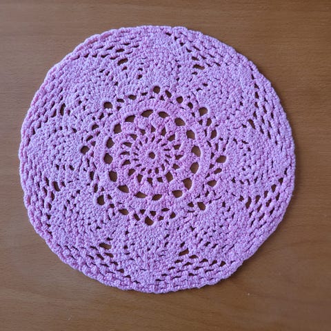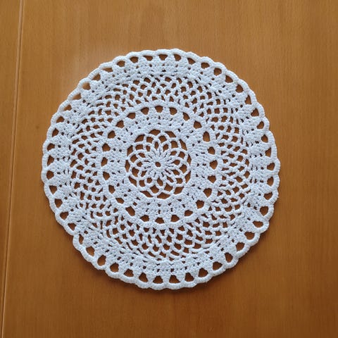 Flot hjemmelavet dug /flakon (hæklet tror jeg?) i fin kongeblå farve. Den er simpelthen så flot og pænt stor. Ca. 45 cm i diameter. Fantastisk mønster og forholdsvis kraftig.