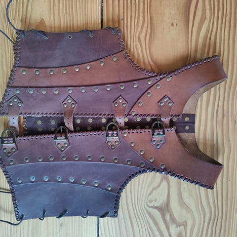 LARP udstyr sæt bestående af forskellige dele til rollespil. Sættet omfatter blandt andet bryst- og skulderrustning i læder, læderbælter og tasker, armbeskyttere og håndledsbeskyttere, pilekogger i læder, bue og pile med polstrede spidser, polstrede skumsværd, rundt skjold samt forskellige kapper, tøjstykker og en kædehaube eller kædetrøje. Materialerne er primært læder, tekstil, kæde og skum/gummi, egnet til live rollespil og udklædning. Størrelserne fremstår som voksenstørrelser. Ingen specifik mærkeangivelse på delene. Giv et bud!