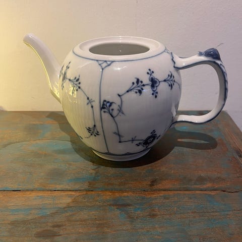 Tekande i porcelæn i hvid med blåt mønster. Klassisk form med hank, tud og låg med knop. Egnet til servering af te ved borddækning eller til daglig brug.