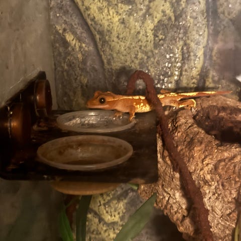 Coco er en smuk lilly white krone gekko på ca 2.5-3 år og han er mega tam. Han kan godt lide at hoppe lidt rundt når han er ude af terrariet og han elsker at sove i sin kokosnød. Jeg sælger ham da jeg har mistet interessen og håber at Coco kan på et nyt hjem ved nogen der tager sig godt af ham som jeg har gjort det stykke tid jeg har haft ham. Coco vejer ca 28 g og er ikke den største af hans alder men han har det godt og det er jo det vigtigste🤩❤️